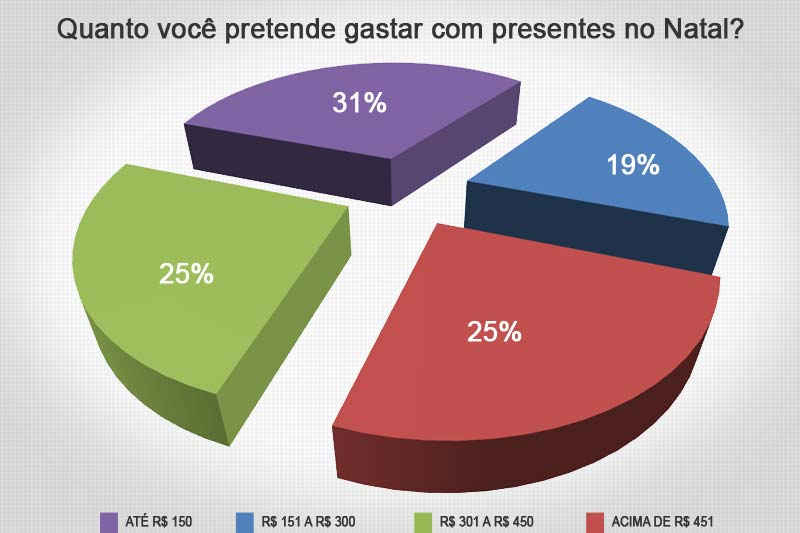 Quanto será gasto com presentes de Natal neste ano? O questionamento foi respondido espontaneamente do dia 8 a 15 de dezembro por 16 internautas que acessaram a capa do Canal Içara. Dentre eles, 31% apontaram que utilizarão até R$ 150. Outros 25% gastarão de R$ 301 a R$ 450. A mesma porcentagem representa os consumidores que comprarão acima de R$ 451. Outros 19% ficarão na faixa dos R$ 151 a R$ 300.