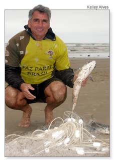 Everton Luiz Espíndola, morador da comunidade de Barra Velha, atua na atividade há três anos. Antes disso, pescava somente por hobby. Hoje é por uma necessidade. Everton conta que não recebeu o Defeso, pois ainda não tem um ano da carteira de pesca. “O defeso é uma boa ajuda, porque viver só de peixes não seria possível”, completa Francisco dos Santos, associado da Colônia de Pescadores Z-33 há mais de um ano. Ele tem no carro os adesivos e crachás de identificação para poder transitar com o automóvel livremente pela orla. É próximo do veículo que fica enquanto espera algum pescador puxar a rede do mar com peixes para então entrar na água.