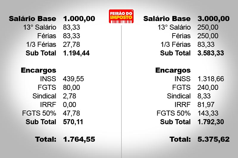 Conforme a presidente em exercício Janine Richetti, todo trabalhador tem descontado de oito a 11% para a Previdência Social. O empregador arca com mais 25,8%. Além disso, a carga do Imposto de Renda varia de 7,5% a 27,5%. "Não podemos esquecer que qualquer verba recebida entra neste cálculo: comissões, horas extras, 13° salário e férias", aponta. Um salário de R$ 1 mil custa, por exemplo, R$ 1,7 mil.