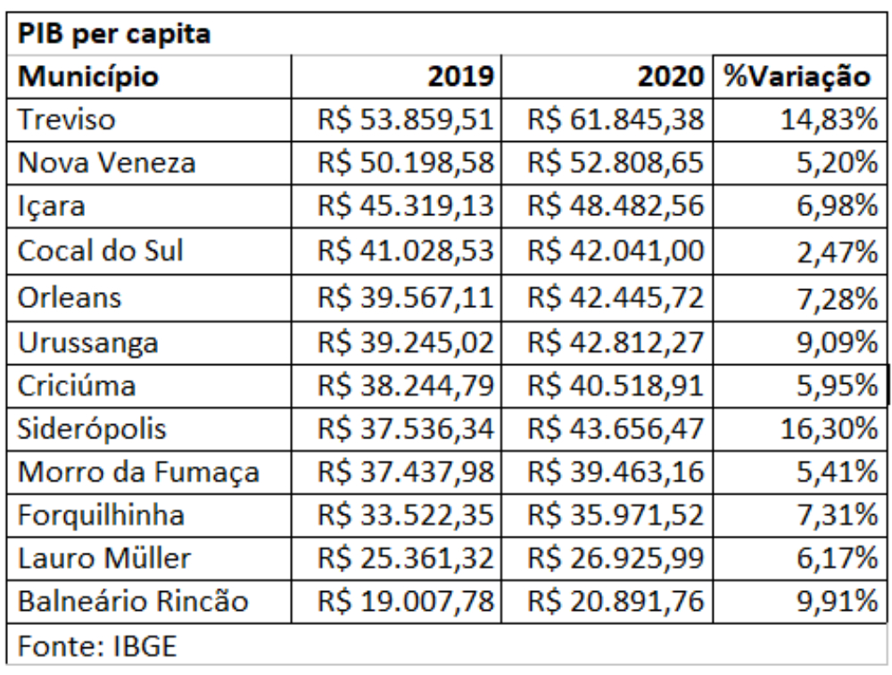 Com o desempenho, Içara manteve o segundo maior PIB da Região Carbonífera, atrás apenas de Criciúma, que chegou a R$ 8.805.203.820 em 2020, e bem à frente do terceiro colocado, Forquilhinha, com R$ 978.821.040.