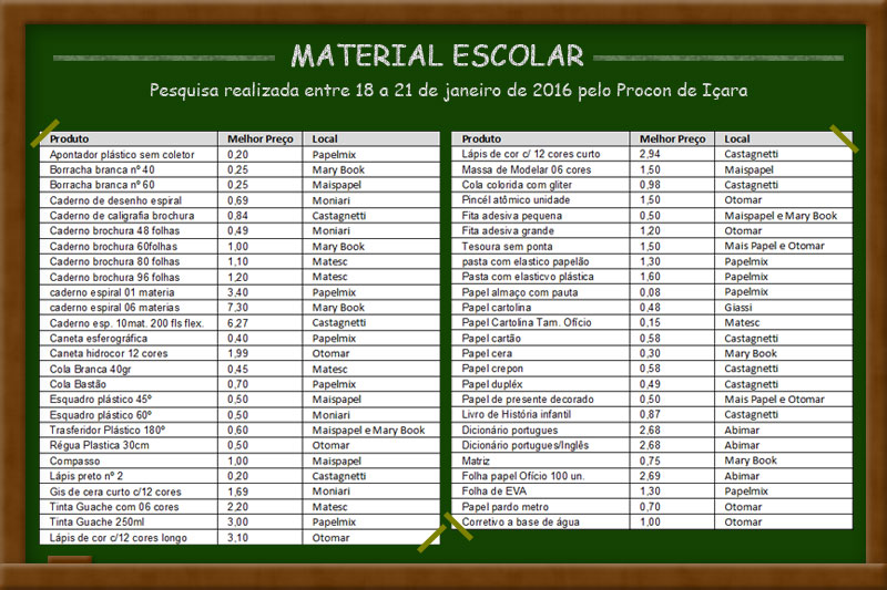Os 51 itens de material escolar pesquisados pelo Procon de Içara tiveram acréscimo de 21% com o aumento dos preços mínimos de R$ 56,86 no último ano para R$ 68,67 em 2016. A diferença desta vez chegou a 165% no comparativo geral da lista entre os nove estabelecimentos participantes. A maior discrepância foi constatada no preço de um caderno brochura com 48 folhas com 1122% na variação de R$ 0,49 a R$ 5,99.