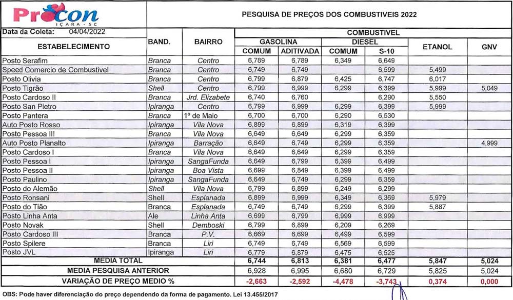 O preço médio dos combustíveis em Içara sofreu uma queda de 2,34% em comparação geral com a última pesquisa realizada há 20 dias. Conforme os dados coletados pelo Procon nesta segunda-feira, dia 4, a média da gasolina comum ficou em R$ 6,744 por litro, uma redução de 2,663% em comparação com a última pesquisa. Na gasolina aditivada a queda foi de 2,592%, no diesel a diferença atingiu 4,478%, no diesel S-10 foi de 3,743% enquanto o GNV não houve alteração e o etanol pouco variou: apenas 0,374% de março para abril.