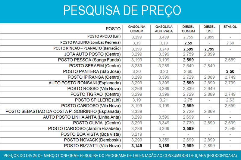 Os consumidores que optarem pelos postos de Içara podem encontrar variação de até 12,85% nos combustíveis. Isto significa R$ 20,50 no abastecimento de um tanque de 50 litros com gasolina aditivada. O valor é apontado na primeira pesquisa realizada pelo Programa de Orientação ao Consumidor (Procon) nos 20 estabelecimentos da cidade. A divulgação nesta quarta-feira é baseada nos preços praticados até terça, dia 24.