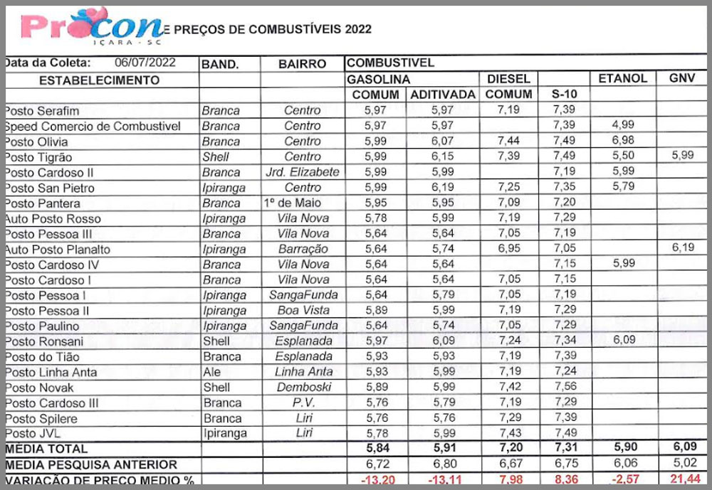 O Procon de Içara divulgou uma nova pesquisa de preços dos combustíveis de 22 postos da cidade na manhã desta quinta-feira, dia 7. Com as novas regras tributárias implementadas pelos governos estadual e federal, com a diminuição dos impostos que incidem sobre a gasolina, a redução média chegou a 13,20% na comparação com os dados anteriores, de 31 de maio. A gasolina aditivada teve uma dedução de 13,11% e o etanol uma queda de 2,57%. Já o diesel comum teve aumento de 7,98%, o diesel S-10 de 8,36% e o GNV de 21,44%.