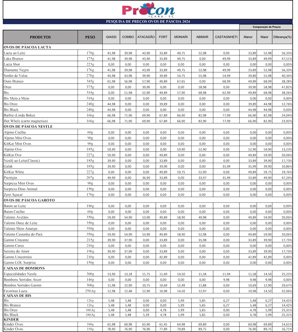O Programa de Proteção e Defesa do Consumidor (Procon) de Içara divulgou a pesquisa de preços dos ovos de Páscoa nos supermercados da cidade nesta quinta-feira, dia 21. Ao todo, foram avaliados sete estabelecimentos e comparados 46 produtos. A maior diferença foi de 56,33%, neste caso, do ovo Lacta ao leite 170g e do Diamante Negro 176g, ambos com valor de R$ 33,89 a R$ 52,98.