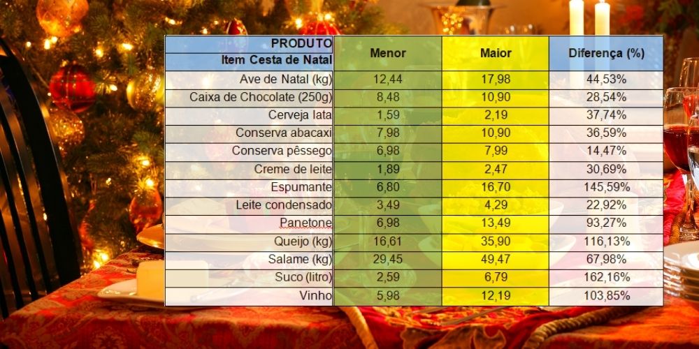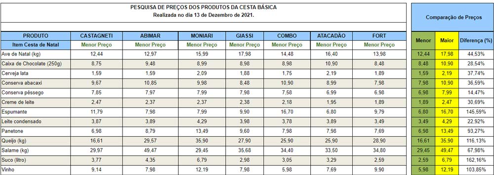 O Procon de Içara pesquisou o preço de 13 itens da cesta de Natal. E, conforme os dados coletados nesta segunda-feira, dia 13, a diferença de produtos chegou até 162,16%. Foi o caso do litro de suco, de R$ 2,59 a R$ 6,79 no menor preço praticado entre os supermercados. Já o espumante foi encontrado de R$ 6,80 a R$ 16,70, uma variação de 145,59% entre os sete estabelecimentos.