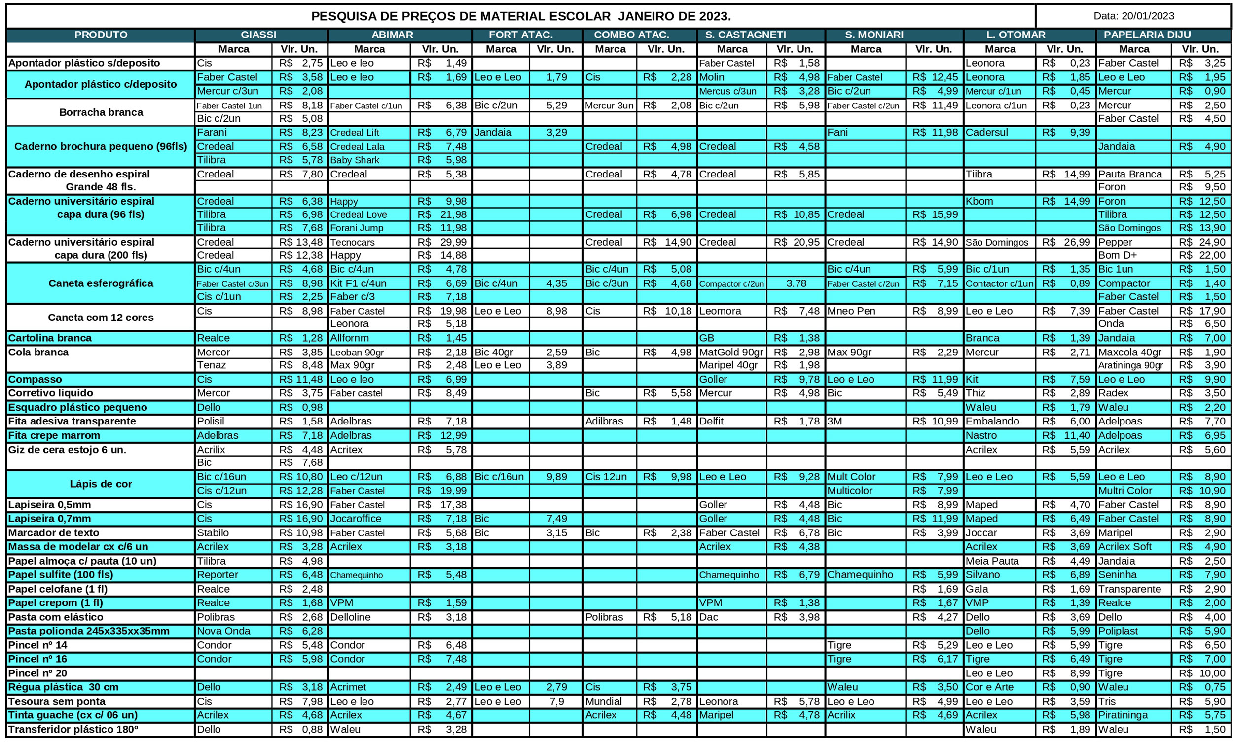 “Nosso objetivo é fazer com que o consumidor ande menos e também erre menos na sua própria pesquisa. Sabemos que as coisas estão muito difíceis nos dias de hoje e pesquisar preços acaba sendo a melhor opção para se obter economia”, comenta o diretor do Procon Renato Noveli. Abaixo está a lista completa. Para ver com melhor resolução, basta fazer a o download e amplificar na tela.