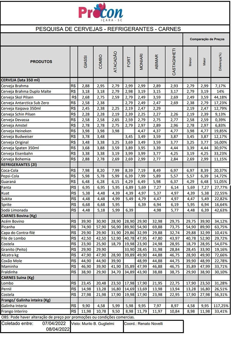 Em paralelo com a pesquisa dos preços de chocolates, o Programa de Proteção e Defesa do Consumidor de Içara também realizou uma pesquisa de preços de 37 itens, entre eles, cervejas, refrigerantes e carnes. Os dados coletados em sete supermercados do município – entre os dias 7 e 8 - foram divulgados neste domingo, dia 10..
