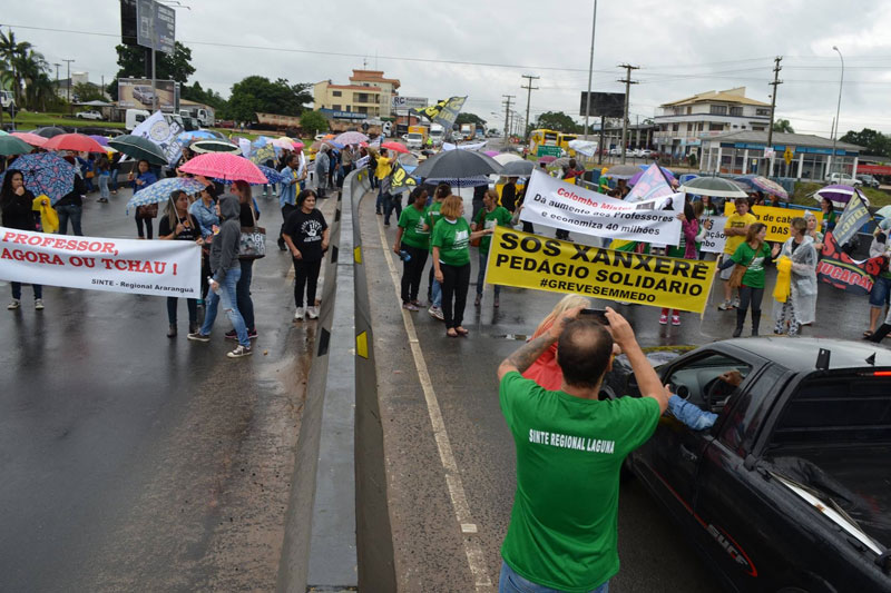 Os professores da rede estadual fecharam a passagem da Rodovia Deputado Paulino Búrigo (SC-445) sobre a BR-101 na tarde desta quinta-feira, dia 23. A manifestação ocorreu em protesto contra o Governo do Estado devido a proposta de mudanças na carreira da categoria. Além disso, o ato macrorregional ocorreu junto com um pedágio em prol das vítimas do tornado em Xanxerê no último fim de semana.