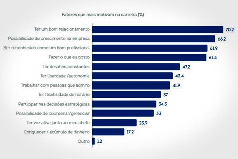 Entre os motivos que geram a satisfação e motivam no ambiente de trabalho está o bom relacionamento (70,2%), possibilidade de crescimento na empresa (66,2%) e reconhecimento como um bom profissional (61,9%). “Não é novidade que grande parte dos profissionais, muitas vezes, passa mais tempo no trabalho do que em casa. Dessa forma, ter um bom relacionamento e um ambiente de trabalho agradável é essencial para manter-se motivado”, afirma o head de Pesquisa e Estratégia da Catho, Luís Testa.