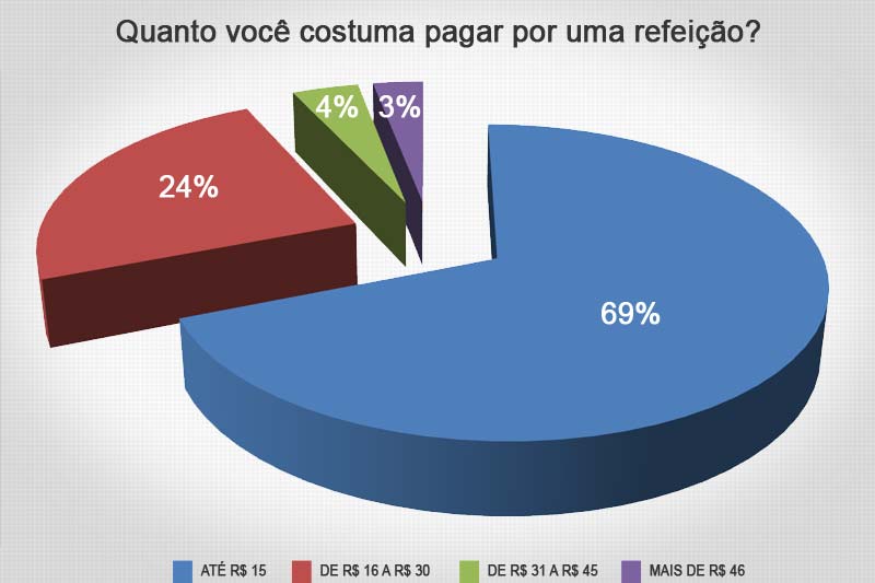 Refeições por até R$ 15 são a preferência dos internautas do Canal Içara. A opção corresponde a 69% dos participantes da enquete realizada pelo portal. Em segundo lugar ficou a faixa de R$ 16 a R$ 30 com 24%. Para 4% o valor pago costuma ser de R$ 31 a R$ 45 enquanto 3% tem uma rotina com alimentação acima de R$ 46. As respostas foram coletadas espontaneamente de 14 a 21 de dezembro. Ao todo participaram 62 leitores.
