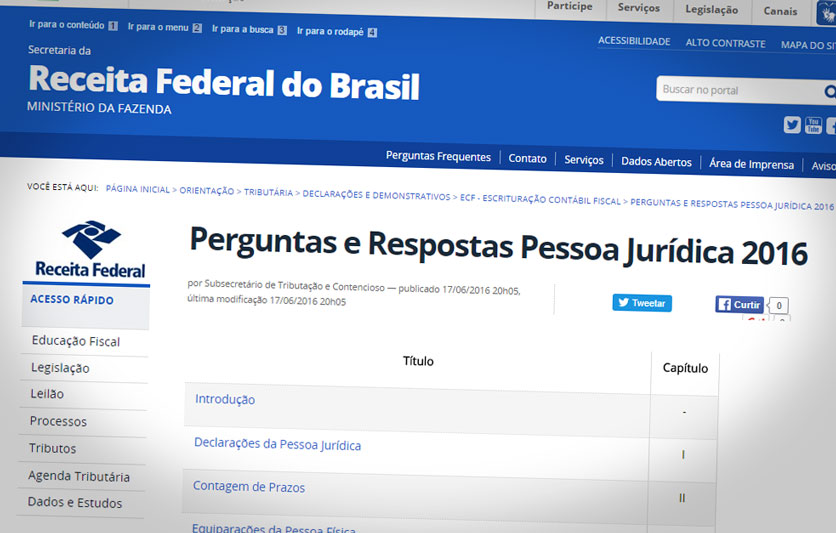 A Receita Federal lançou a edição 2016 do Perguntas e Respostas da Pessoa Jurídica. A lista tem mais de 900 perguntas e respostas elaboradas pela Coordenação-Geral de Tributação (Cosit) relacionadas à tributação, como Imposto de Renda da Pessoa Jurídica e a Contribuição Social sobre o Lucro Líquido (CSLL). O resultado pode ser acessado em http://goo.gl/TSZ90m.