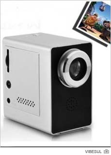 Equipamento de cor prata, com tripé, cabo AV e adaptador de energia. Possui 50 lumens, tem resolução de 640x480 pixels, projeta imagens em até 60 polegadas e inclui caixa de som embutida. Tudo isso num equipamento com 5,5cm x 6cm x 3,5cm.