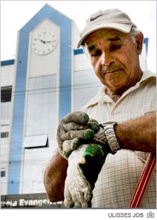 Trabalhando como jardineiro na praça Maria da Silva Rodrigues em frente à Assembleia de Deus, Pereira afirma não se incomodar com a presença acentuada do sol, já que se refugia nas sombras das árvores. “Às vezes, quando o sol está muito forte e tem pouca chuva, é preciso molhar as plantas com a mangueira”, menciona.
