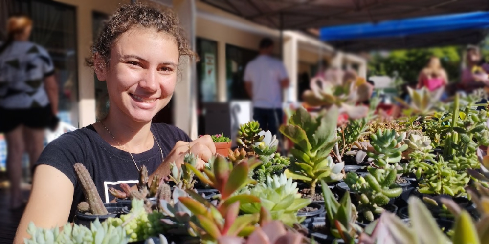 A produção de plantas ornamentais de Fabiana Felício começou com palmeiras e outras espécies, mas por volta de 2019 ganhou impulso com o cultivo de suculentas, a partir da participação em feiras e de mudas presenteadas por uma amiga. Atualmente, já são 128 variedades cultivadas em três estufas na comunidade de Sanga Funda, em Içara.