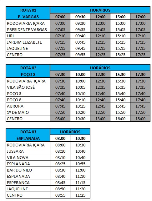 Os trajetos partem do Centro, no terminal rodoviário, e retornam ao mesmo ponto. Uma das linhas envolve o roteiro ao Presidente Vargas, Liri, Jardim Elizabete, Jaqueline e Centro. Outra com Vila São José, Poço Três, Poço Oito, Aurora e Primeiro de Maio. Também há o roteiro com Jussara, Vila Nova, Esplanada, Esperança e Jaqueline.