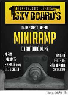 A primeira edição do Sky Board´s Mini Ramp vai ser realizada junto com a Festa de São Donato de 2013. A disputa acontecerá a partir das 9h do dia 4 de agosto com o fechamento parcial da Rua João Lodetti. Enquanto o DJ Antônio Kunz estiver no comando do som, será realizada a disputa das categorias mirim, iniciante, amador e old school com premiação em material esportivo, camisetas, bonés e tênis.
