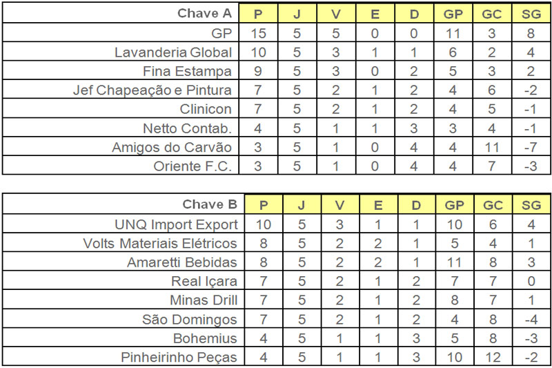 O GP conquistou a primeira vaga para a segunda fase com dois gols de André, um de Lucinho e outro de Rodrigo. O Amigos do Carvão diminuiu com Leonardo e Jeferson. No caso do Volts, o placar contra o Bohemius teve o tento de Josué. Já o São Domingos quebrou a invencibilidade da Amaretti com Max e Adriano enquanto o desconto ficou para Felipe.