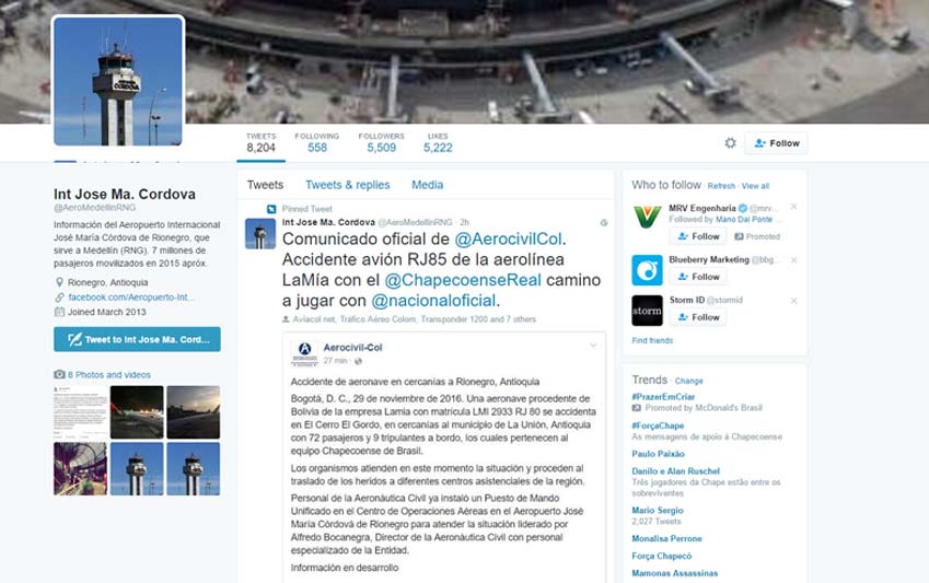 No texto divulgado no Twitter, o aeroporto informou que a torre de controle recebeu às 22h [hora de Bogotá] comunicado do piloto de que o avião, da empresa Lamia Corporation, procedente de Santa Cruz de la Sierra, estava em situação de emergência, entre o município de La Ceja e La Unión, com falhas elétricas. Imediatamente, foram mobilizados o Comitê Operativo de Emergência, com a presença de funcionários da prefeitura de Rionegro, da Polícia Aeroportuária, Força Aérea Colombiana, de bombeiros e autoridades.