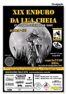 O XIX Enduro da Lua Cheia será realizado nos dias 27 e 28 de janeiro de 2007 em Içara, no Balneário Rincão, valendo pela 1ª e 2ª etapa da Copa ASCPE. De todo o trajeto que deverá ser percorrido, 80% das trilhas já estão levantadas no GPS.