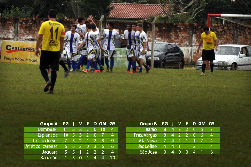 O Presidente Vargas também subiu uma posição no Grupo B e fechou a primeira fase na vice-liderança. Os gols desta tarde foram de Clemilson e duplamente André Simon. Os dois descontos no Estádio Municipal Dego Rocha ficaram por conta de Tiago Recco. No Estádio da Colina, o Jaguara obteve a primeira vitória na categoria com o gol contra de Marcos Antônio, do Atlético Içarense. Em Esplanada, o time da casa contou com bruno Nunes e Everton enquanto Mário reduziu a diferença. No barracão, o União do Sul balançou a rede com Robson e Rafael. O Demboski igualou então com Jonas e Nazareno.