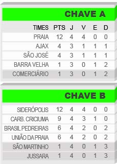 PRÓXIMOS JOGOS - Para completar a primeira fase acontecerá a quinta rodada a partir do próximo dia 1. Começará com Comerciário x Ajax às 15h. Em seguida terá União da Praia x Brasil Pedreiras. No domingo pela manhã continuará com Barra Velha x São José. Já na parte da tarde terá Siderópolis x Jussara e Carbonífera Criciúma x São Martinho.