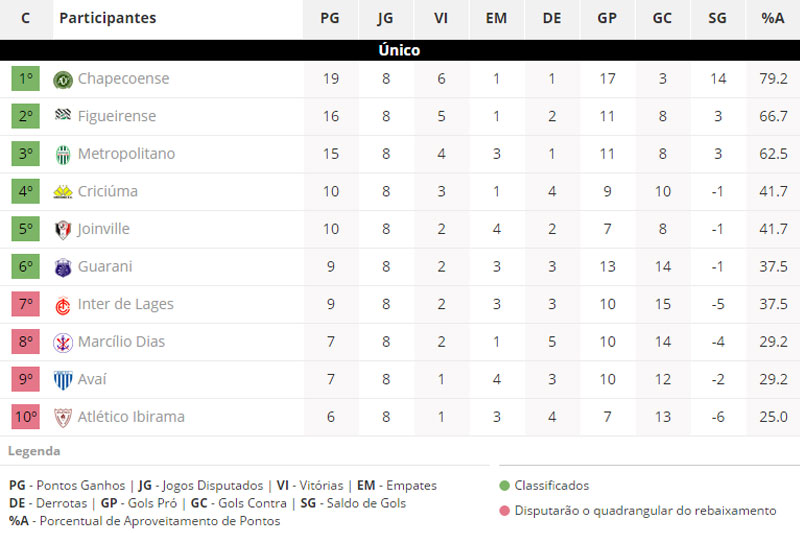 A Chapecoense chegou a 19 pontos com 3x0 em cima do Atlético de Ibirama neste domingo, dia 1. O Figueirense empatou em 1x1 com o Avaí e aparece na vice-liderança com 16. O Metropolitano venceu Joinville por 1x0. O Criciúma aplicou 1x0 no Marcílio Dias. Já o Guarani anotou 2x0 em cima do Inter de Lages.