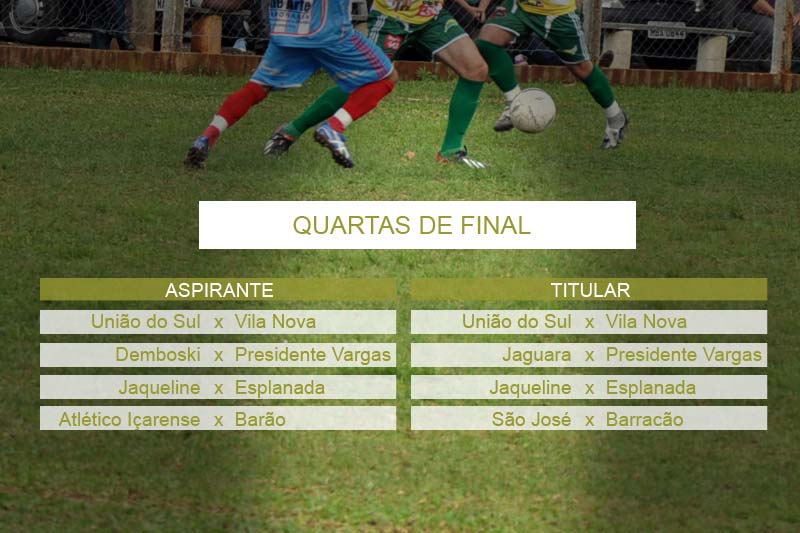 Já no próximo domingo, o União do Sul receberá Vila Nova. Em paralelo, o Jaqueline iniciará as quartas de final diante de Esplanada nas duas categorias. O restante da tabela seguirá com cruzamentos diferenciados. O Jaguara enfrentará o Presidente Vargas pelo Titular enquanto no Aspirante o compromisso do PV acontecerá contra o Demboski. A rodada terá ainda São José x Barracão com o jogo de fundo entre Atlético Içarense e Barão.