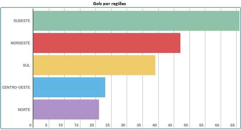 Levando em consideração os gols dos clubes por regiões do país, o Sudeste dispara na liderança, com 66 gols. Na vice-liderança aparece o Nordeste, com 53. O Sul fica em terceiro, com 44 gols, seguido por Centro-Oeste, com 22 e Norte, com 14.