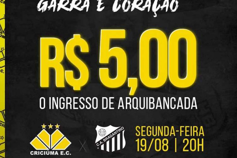 O Criciúma terá nesta segunda-feira, dia 19, mais um desafio na disputa da Série B do Campeonato Brasileiro. A partir das 20h, o Tigre enfrenta o Bragantino no estádio Heriberto Hülse, pela 17ª rodada da competição nacional. Para contar com o apoio da torcida carvoeira, o clube preparou uma promoção especial de ingressos de arquibancada no valor de R$5,00.