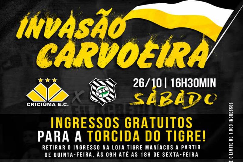 O Criciúma disponibilizou ingressos de arquibancada para os torcedores do Tigre para a partida contra o Figueirense, em Florianópolis, neste sábado, dia 26. A “Invasão Carvoeira” é mais uma ação da campanha “Todos Juntos Pelo Tigre”. A partida válida pela 31ª rodada da Série B do Campeonato Brasileiro ocorre às 16h30, no estádio Orlando Scarpelli.