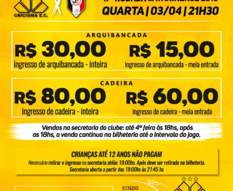 O Criciúma realiza nesta quarta-feira, dia 3, às 21h30, partida contra o Joinville, no estádio Heriberto Hülse, pela 17ª rodada do Campeonato Catarinense. Para o duelo, o Tigre promove promoção especial de ingressos para o torcedor carvoeiro apoiar a equipe em busca de mais um resultado positivo.