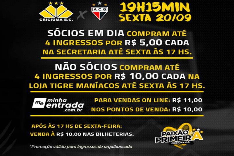 O Criciúma joga nesta sexta-feira, dia 20, às 19h15, contra o Atlético Goianiense, no estádio Heriberto Hülse, pela Série B do Campeonato Brasileiro. Para essa partida, o Tigre irá fazer uma promoção especial para o torcedor carvoeiro, a “Quem ama está sempre junto”. Os sócios em dia podem comprar até quatro ingressos de arquibancada a R$ 5,00 cada até às 17h desta sexta-feira, dia 20, na secretaria anexa ao Majestoso.
