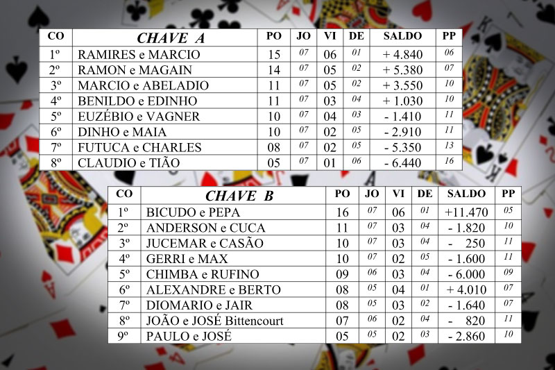 Ramires e Márcio, Ramon e Magain, Márcio e Abeladio, Benildo e Edinho, Euzébio e Vagner, além de Dinho e Maia já estão garantidos na segunda fase do campeonato de canastra em dupla do Clube dos 50. Pelo Grupo A se despediram então Futuca e Charles, Cláudio e Tião. Já na Chave B, restam ainda mais jogos para o carimbo no passaporte das seis primeiras equipes. Os confrontos ocorrerão ao longo desta semana.