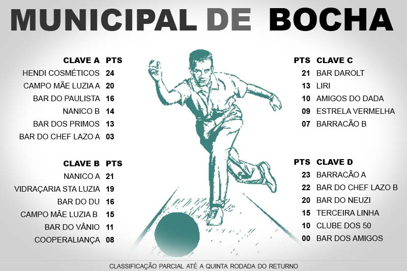 O Campeoanto Municipal de Bocha está com as oitavas de final definidas. A segunda fase da competição terá Estrela Vermelha x Hendi Cosméticos, Nanico B x Bar Darolt e Amigos do Dada x Campo Mãe Luzia A na terça-feira, dia 7. Já na quinta o turno da etapa continuará com Bar do Paulista x Liri, Terceira Linha x Nanico A, Campo Mãe Luzia B x Barracão A, Bar do Neuzi x Vidraçaria Santa Luzia e Bar do Du x Chef Lazo B.