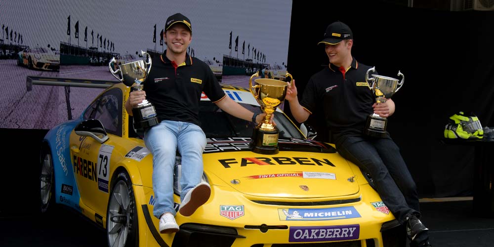 A dobradinha de Enzo Elias e Jeff Giassi rendeu o terceiro lugar geral, segundo na Sport e a vitória na Trophy da Porsche Endurance Series em Goiânia (GO) neste fim de semana. Este foi o segundo pódio consecutivo dos pilotos da Equipe Farben. “Estou muito feliz com o trabalho que estamos fazendo. Conseguimos duas vitórias na categoria até agora, liderando o campeonato e na disputa pela geral. Nunca tinha andado nessa pista, o Enzo me ensinou todos os segredos de andar aqui e deu muito certo”, ressalta Jeff.