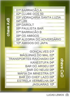 As oitavas de final iniciam já nesta terça-feira. A partir de agora será apenas um confronto por noite. O primeiro acontecerá entre o Barracão A e o Bar do Chef Lazo. No dia 30 terá Clube dos 50 x Máfia da Minestra. No dia 5 continuará com Vidraçaria Santa Luzia x Bar do Neusi. No dia 6 será com Liri x Bar do Argeu. A sequência acontecerá ainda com Darolt x Kanestufa, Paulista Bar x Transportes Raichaski, Barracão B x Máquinas do Mal e, no dia 13, Os Amigos x Gonçalves.
