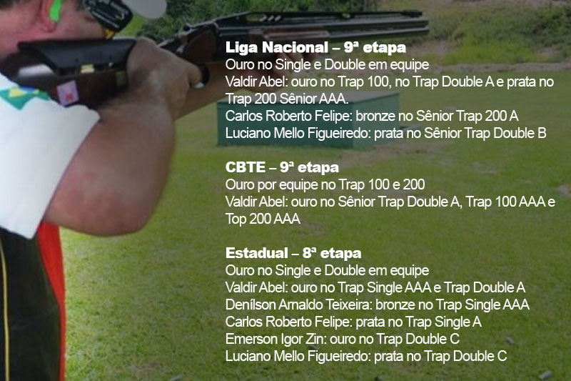 Em paralelo, Valdir lidera no Sênior Trap 100 AAA, no Trap 200 AAA e figura em terceiro no Double A na Confederação Brasileira de Tiro Esportivo. Já Carlos Roberto é vice-líder no Trap 100 e 200 A. Pela disputa estadual, a Guerini Team/FME Içara também aparece no topo. Igualmente ocorre com o atirador Valdir no Single AAA. Luciano é vice no Single AA e Carlos Roberto ostenta a liderança do Single A e a terceira colocação no Double B.