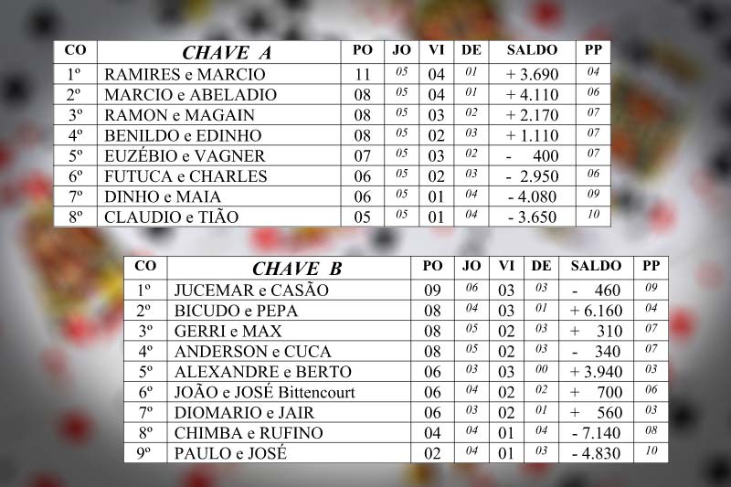 No Grupo A, Ramires e Márcio continuam líderes. A dupla venceu Dinho e Maia no Campeonato de Canastra do Clube dos 50 na noite de segunda-feira, dia 6. Já no Grupo B o topo da tabela teve alteração. Com a derrota de 2x1 para Paulo e Badejo, o time de Bicudo e Peda caiu para a segunda colocação. No lugar assumiu então Jucemar e Casão em consequência da vitória de 3x0 em cima de Chimba e Rufino.