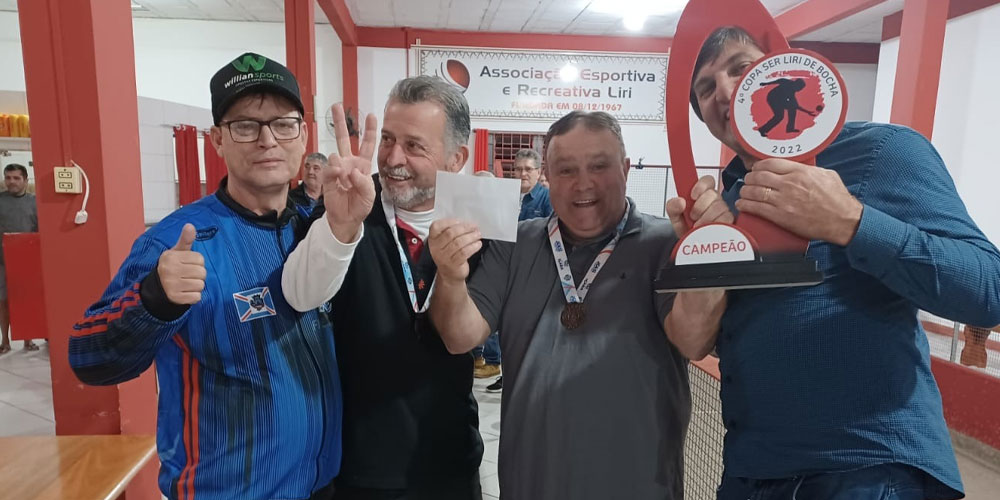 Com uma vitória de 2x1, a Sociedade Esportiva Recreativa Liri conquistou o 4° Campeonato de Bocha em Duplas 2022 na noite desta sexta-feira, dia 23. O título foi construído por Alemãozinho e Natal sobre o time da Santa Cruz, com Bia e Alex. A primeira parcial teve 12x1 para o Liri. A segunda ficou com Santa Cruz com 12x8 e a definição ficou então para a última partida com 12x7.