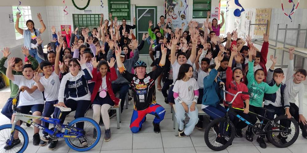 Os alunos da Escola Alaíde Tabalipa receberam o projeto Memórias para o Futuro - Fortalecendo a Mente, Formando Vencedores – com dois atletas de destaque nesta quinta-feira, dia 23. Pela manhã, o campeão de BMX, Marco Aurélio Rodrigues, o Tocha, interagiu com os jovens de Esplanada e demonstrou na prática a importância do trabalho com propósito. À tarde foi a vez de Lucas Colonetti apresentar a importância da disciplina para as conquistas que obteve no powerlifting e inspirar as crianças e adolescentes a também sonharem.