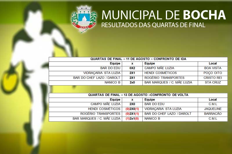 Para chegar à decisão do Municipal de Bocha, os times terão mais uma etapa nesta semana. O primeiro turno semifinal ocorre a partir já desta próxima quinta-feira, dia 20. A penúltima fase da II Taça Silva Pré-moldados começará com Bar do Chef Lazo x Campo Mãe Luzia no bairro Cristo Rei e Vidraçaria Santa Luzia x Bar Marques em Poço Oito. Na quarta-feira da semana seguinte, o mando da cancha será invertido em benefício então de Campo Mãe Luzia e na quinta para o Bar Marques.