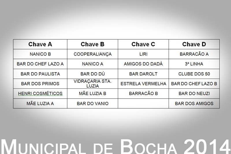 Uma nova sequência do Municipal de Bocha será aberta nesta terça-feira, dia 12. A terceira rodada começará com Nanico B x Primos, Henri Cosméticos x Paulista, Chef Lazo A x Mãe Luzia A, Santa Luzia x Cooperaliança, Mãe Luzia B x Dú e Vânio x Nanico A. Já na quinta-feira será a vez então de Estrela Vermelha x Amigos do Dadá, Barracão B x Liri, Chef Lazo B x Barracão A, Clube dos 50 x Neuzi e Amigos x Terceira Linha.