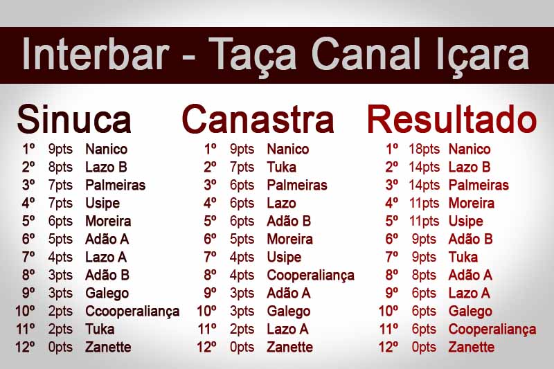 O primeiro turno do Interbar foi conquistado pelo Nanico. Em segundo lugar geral está o bar do Chef Lazo e na terceira colocação o Palmeiras. A classificação, no entanto, é apenas uma prévia já que não carimba ainda o passaporte de nenhuma equipe. A disputa do returno inicia já nesta próxima semana. Na segunda-feira terá Adão A x Moreira. Na terça continuará com Marquinhos x Lazo A, Cooperaliança x Galego, Zanette x Lazo B, Usipe x Adão B e Tuka x Palmeiras.