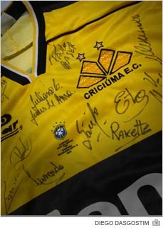 "Consegui a camiseta e os autógrafos com um amigo. Ele trabalhava numa revenda de caminhão onde um jogador do Criciúma era cliente", relata. "Resolvi fazer por causa do retorno do Paulo Baier. Acho que pode ser algo legal para os torcedores mais fanáticos do Tigre", completa. Segundo ele, quem comprar as duas pelas ainda levará de brinde uma camiseta do Juventude patrocinada pela Parmalat.
