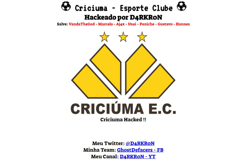 Os internautas que acessarem o website do Tigre perceberão que a página está desfigurada. Com o pseudônimo “D4RKRoN”, um hacker invadiu o site oficial do Criciúma EC neste sábado, dia 23, e deixou uma imagem apenas com o escudo do clube e com mensagens de anúncio às redes sociais do invasor.