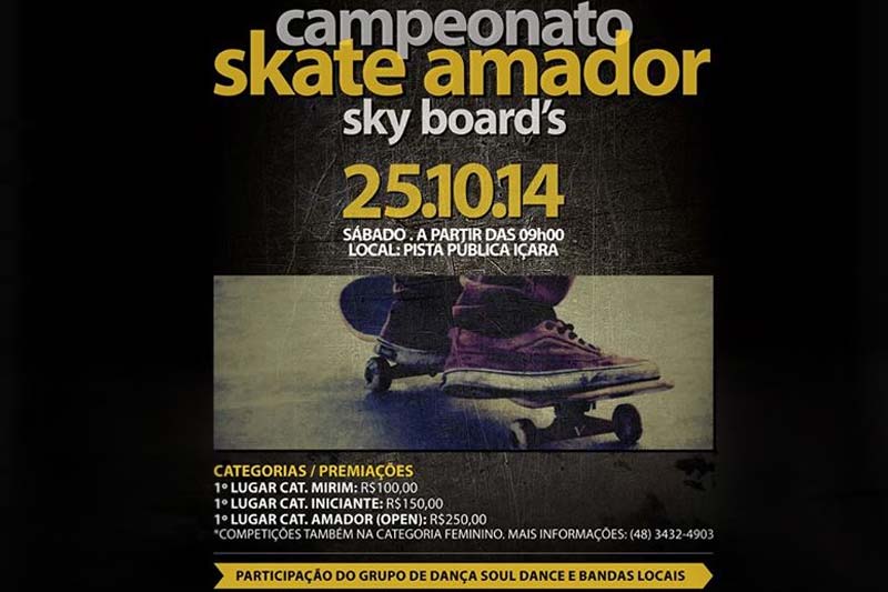 A Sky Board´s vai promover um novo campeonato de skate amador no próximo dia 25. O evento será a partir das 9h na Praça da Juventude Fernando Pacheco com as inscrições feitas no próprio local por R$ 15. Serão premiados os campeões do mirim, iniciante e amador tanto masculino quanto feminino com dinheiro, troféus e mercadorias dos patrocinadores. Além disso, a competição terá o espetáculo do Grupo Soul Dance e de bandas locais.
