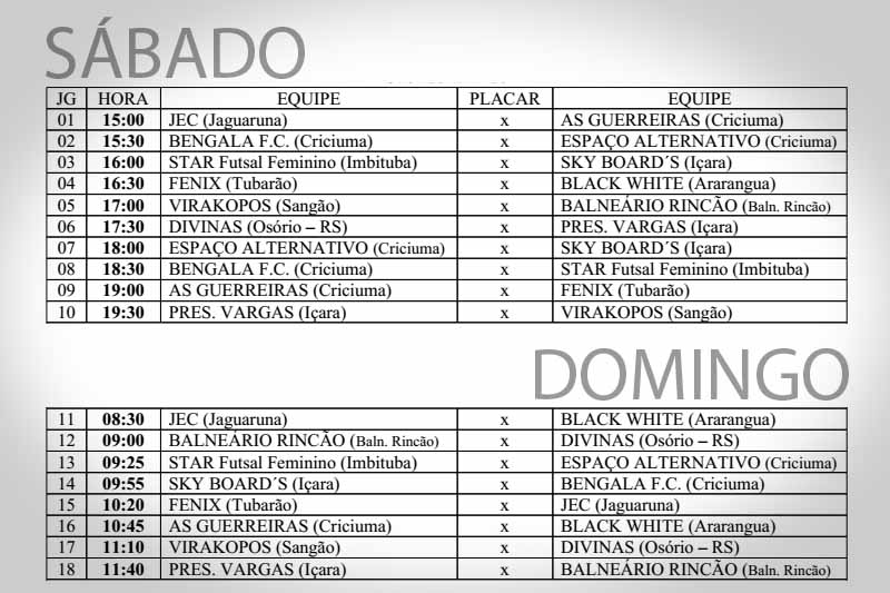 A tabela do Torneio de Futsal Feminino foi apresentada nesta quarta-feira, dia 20. A competição abrirá no próximo sábado com Jaguaruna x As Guerreiras às 15h. Ainda no mesmo dia acontecerão outros nove jogos. O último deles a partir das 19h entre Presidente Vargas e Virakopos. No domingo continuará às 8h30 com Jaguaruna x Black White e ainda pela manhã acontecerá o fechamento da etapa classificatória no ginásio da Sociedade Esportiva e Recreativa do Liri.