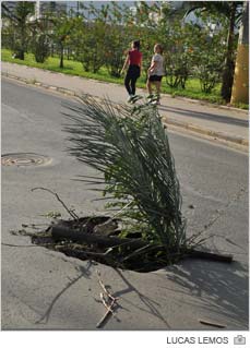 Os galhos no meio da Avenida Procópio Lima são para sinalizar o perigo que há no local. Afinal, uma cratera com cerca de 40 centímetros de profundidade está aberta no trecho próximo ao viaduto da SC-444. O buraco na pavimentação fica entre duas caixas de observação do esgotamento sanitário. Por isso, remete ao Sistema Municipal de Água e Esgoto.