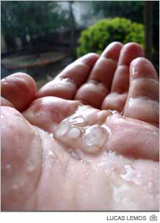 "A gente sempre vê pedras redondinhas, mas, com pontas, nunca tinha visto", exclama a moradora do bairro Presidente Vargas, Neide Aparecida Wassen Nuernberg. Além de Içara, outras cidades da região também tiveram o calor amenizado pelo fenômeno, entre elas, Criciúma.